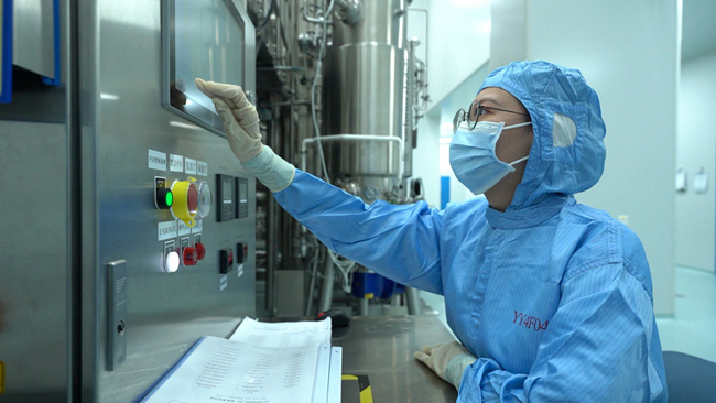 藥企生產人員在控制制藥設備。金賽藥業(yè)供圖