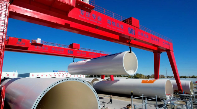 蒙東(通遼)風電裝備制造產業(yè)基地內,一排排風葉和塔筒即將運往全國各地。林林攝