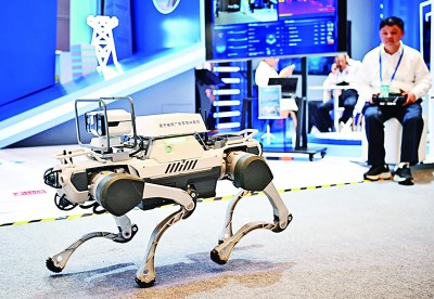 網(wǎng)絡(luò)安全博覽會上的企業(yè)展示電網(wǎng)巡線機器狗。新華社記者 鄧華攝