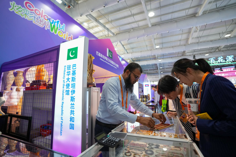 9月12日,在服貿會首鋼園區(qū)的炫彩世界——‘一帶一路’沿線國家特色文化展示活動上,參觀者在巴基斯坦伊斯蘭共和國駐華大使館展區(qū)選購商品。新華社記者 鞠煥宗 攝