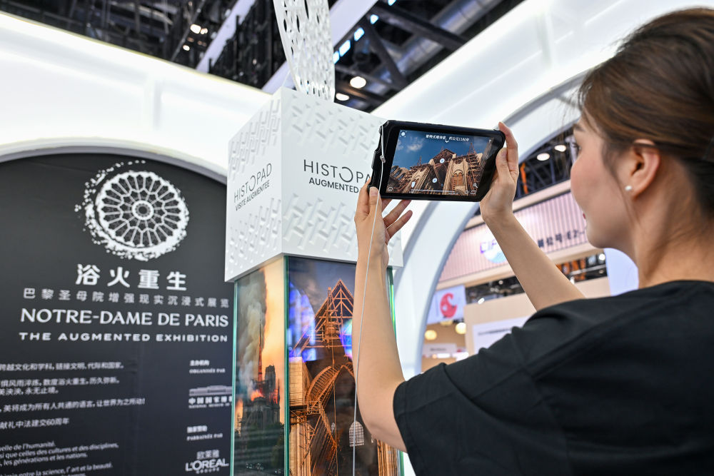 9月12日,法國國家館工作人員介紹“巴黎圣母院增強現實沉浸式展覽”。 新華社記者 李鑫 攝