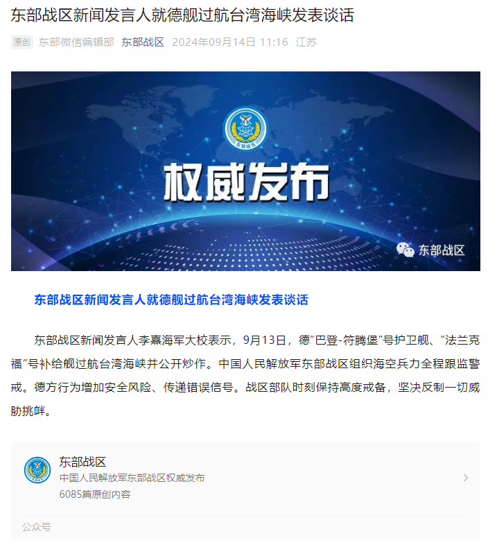 東部戰(zhàn)區(qū)新聞發(fā)言人李熹海軍大校表示,9月13日,德“巴登-符騰堡”號護衛(wèi)艦、“法蘭克?!碧栄a給艦過航臺灣海峽并公開炒作。中國人民解放軍東部戰(zhàn)區(qū)組織??毡θ谈O(jiān)警戒。德方行為增加安全風險、傳遞錯誤信號。戰(zhàn)區(qū)部隊時刻保持高度戒備,堅決反制一切威脅挑釁。