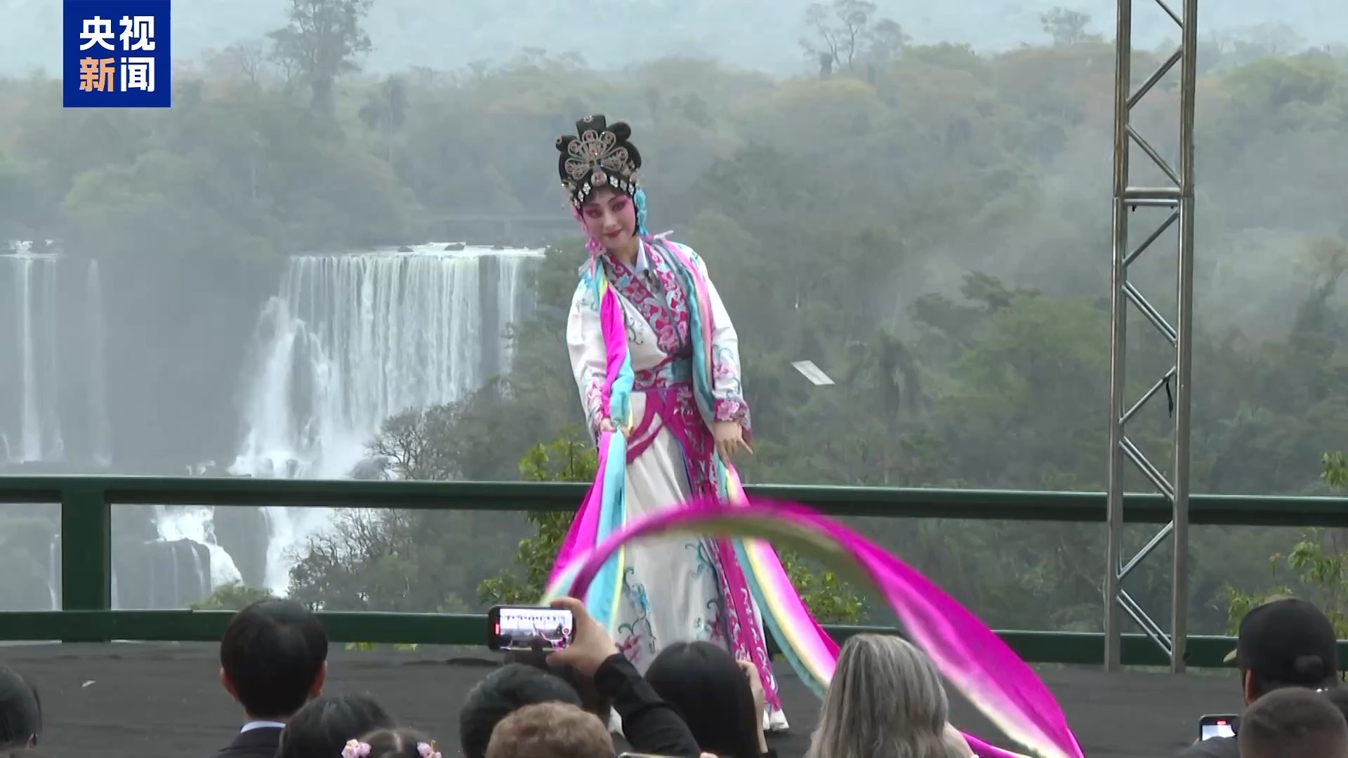在中秋節(jié)來臨前夕,巴西伊瓜蘇市聯(lián)合中國駐圣保羅總領(lǐng)館等共同舉辦“瀑布之夜中秋晚會”。晚會在聯(lián)合國世界自然遺產(chǎn)伊瓜蘇瀑布旁上演,百余名中巴觀眾欣賞了浙江婺劇藝術(shù)研究院帶來的表演。