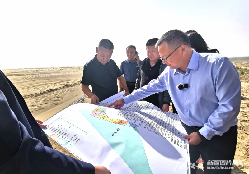 9月5日,民豐縣領(lǐng)導(dǎo)在治沙現(xiàn)場為記者介紹后河壩防沙治沙規(guī)劃。石榴云/新疆日?qǐng)?bào)記者 曹華攝