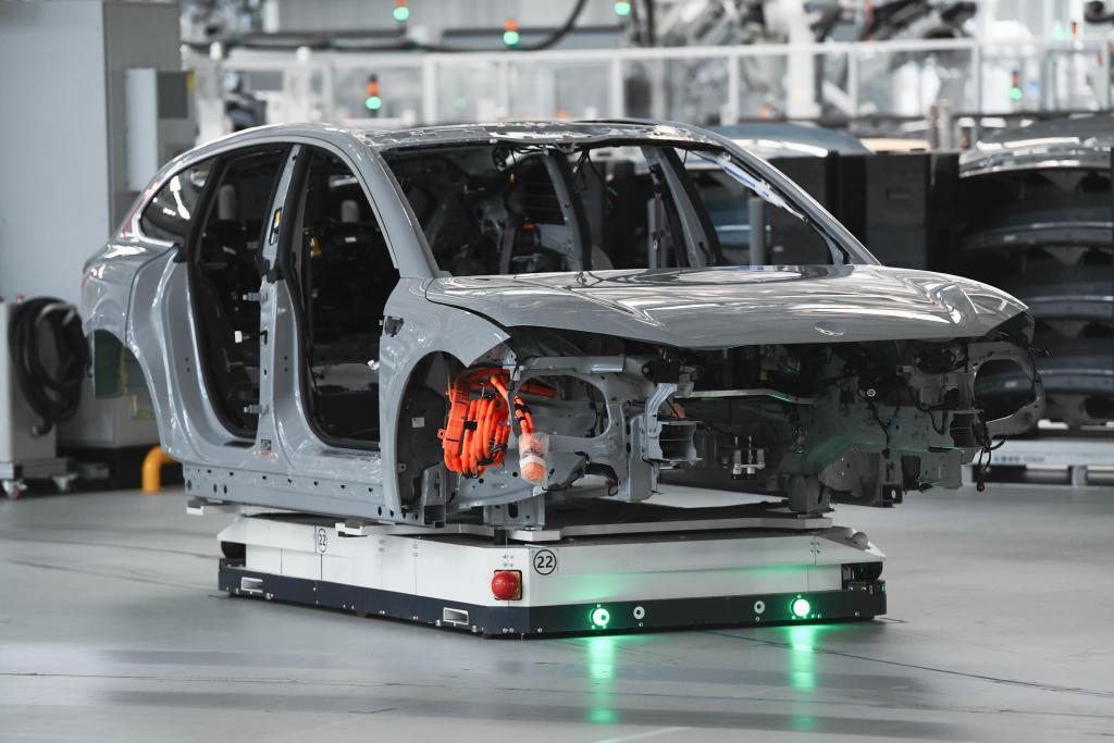 這是在安徽省合肥市新橋智能電動(dòng)汽車(chē)產(chǎn)業(yè)園蔚來(lái)第二工廠拍攝的新能源汽車(chē)生產(chǎn)線(2024年5月9日攝)。新華社記者 張端 攝