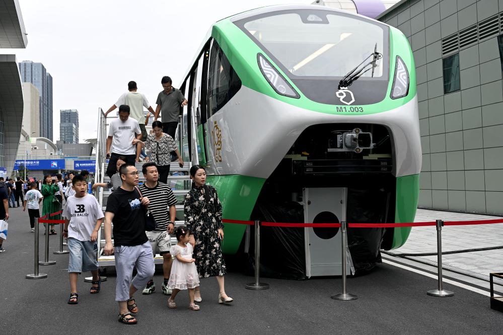 9月21日,在2024世界制造業(yè)大會(huì)上,人們參觀體驗(yàn)一款跨座式單軌列車(chē)。新華社記者 黃博涵 攝