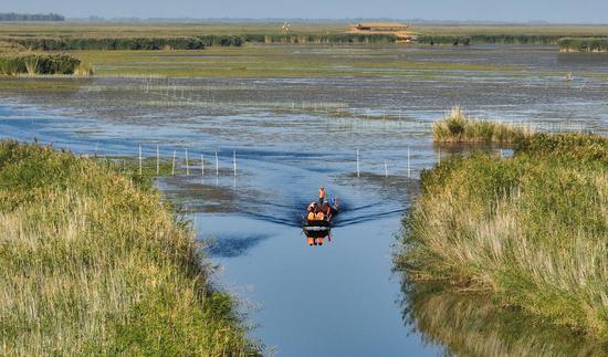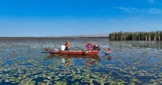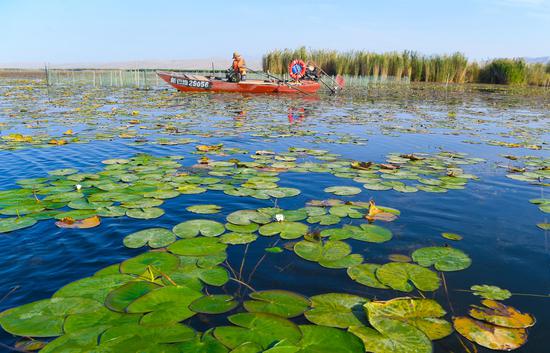 金秋時(shí)節(jié),位于新疆維吾爾自治區(qū)巴音郭楞蒙古自治州博湖縣境內(nèi)的博斯騰湖的螃蟹迎來(lái)豐收季,波光粼粼的湖面上,穿梭的漁船與蘆葦、睡蓮、沙漠構(gòu)成一幅生動(dòng)的秋日畫卷。