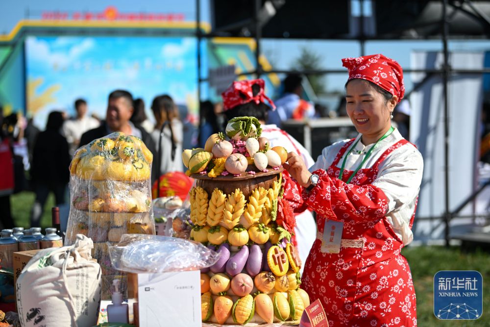 9月22日,在天津市武清區(qū)南蔡村鎮(zhèn)天民田園,工作人員擺放慶豐收為主題的面食作品。