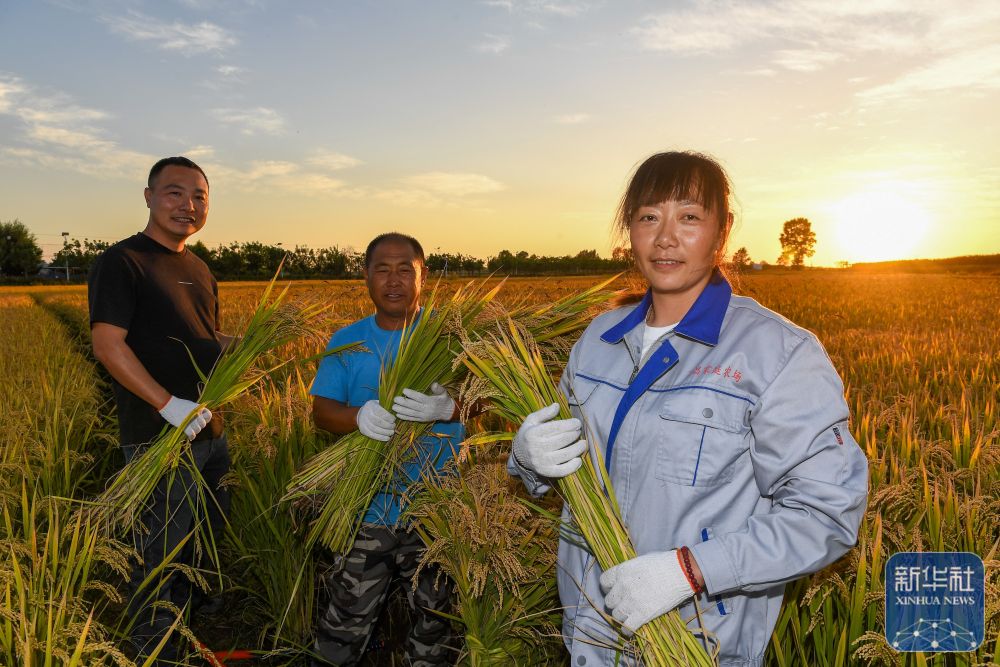 9月20日,在位于吉林省永吉縣萬昌鎮(zhèn)的永吉縣禾谷豐水稻種植農(nóng)民專業(yè)合作社,負(fù)責(zé)人張帥(左一)和兩位農(nóng)民手捧收獲的水稻。