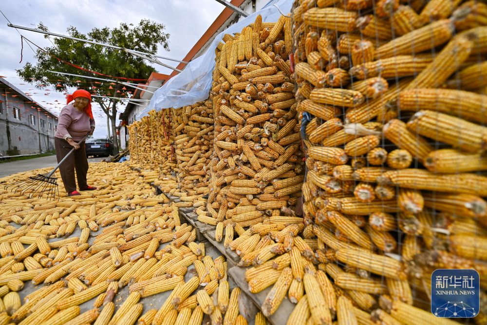 9月21日,山東省青州市黃樓街道后坡村農(nóng)民在晾曬玉米。