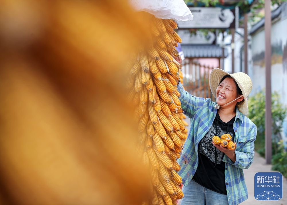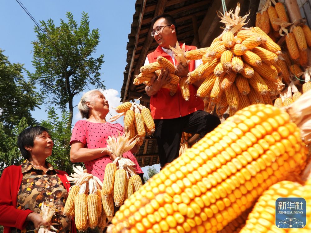 9月22日,在四川省達州市大竹縣朝陽鄉(xiāng)木魚村,駐村工作隊員和村民在晾曬收獲的玉米。
