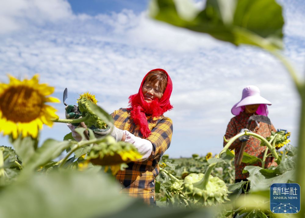9月22日,在江蘇省鹽城市大豐區(qū)萬盈鎮(zhèn)萬豐綠茵現(xiàn)代農(nóng)業(yè)園區(qū),農(nóng)民在采收向日葵。