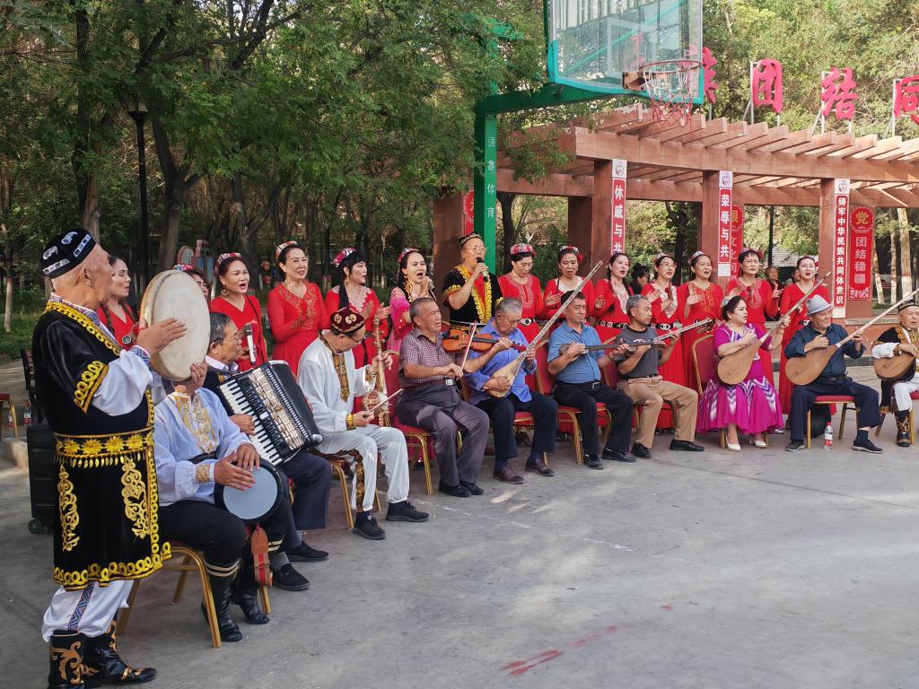 9月19日,庫爾勒市朝陽街道團(tuán)結(jié)社區(qū)“石榴籽藝術(shù)團(tuán)”團(tuán)長(zhǎng)卡得爾·克衣木正帶著團(tuán)員們?yōu)榫用癖硌?。新華社記者顧煜 攝