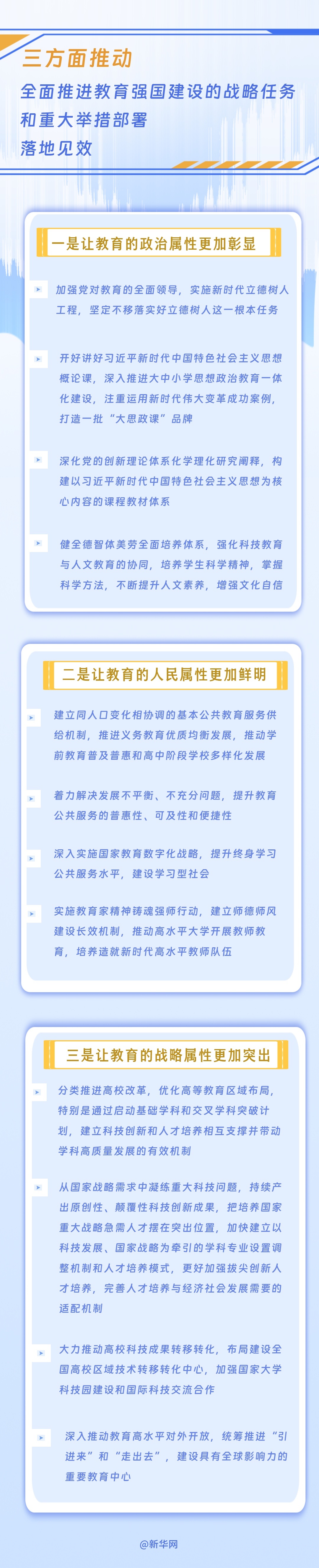 懷進鵬介紹,將重點從讓教育的政治屬性更加彰顯、讓教育的人民屬性更加鮮明、讓教育的戰(zhàn)略屬性更加突出三個方面推進。