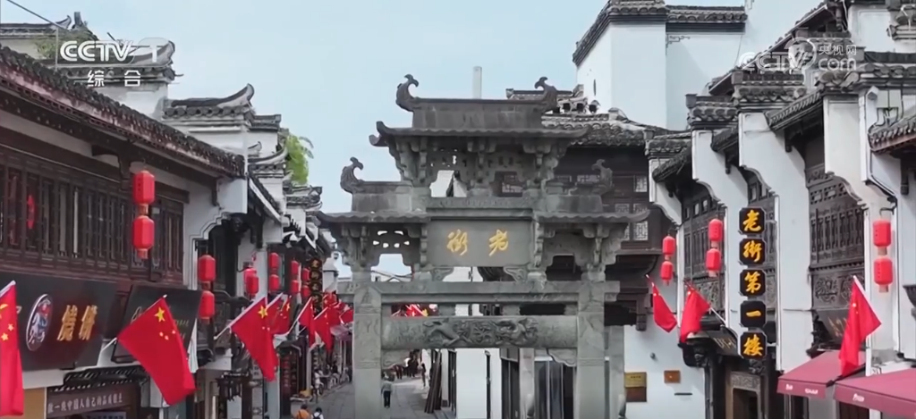 安徽黃山:國(guó)旗與徽派建筑交相輝映 扮靚老街