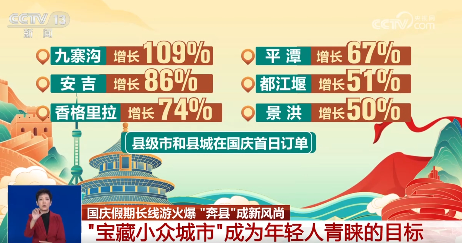 從增速上看,低線、小眾旅游目的地增長潛力巨大,“奔縣”旅游的人越來越多。九寨溝、安吉、香格里拉、平潭、都江堰、景洪等縣級市和縣城在國慶首日都分別實(shí)現(xiàn)訂單109%、86%、74%、67%、51%、50%的增長。