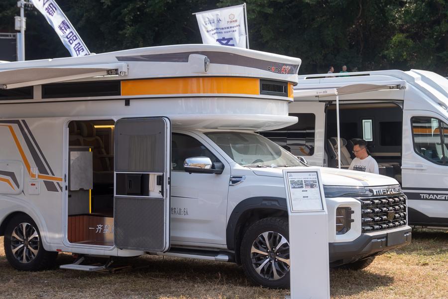 9月28日,參觀者在戶外運動裝備展上參觀房車。新華社記者 杜子璇 攝