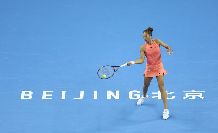 10月2日,鄭欽文在比賽中回球。當日,在北京進行的2024中國網球公開賽女子單打第四輪比賽中,中國選手鄭欽文2比1戰(zhàn)勝美國選手阿尼西莫娃,晉級八強。新華社發(fā)(杜昕怡攝)