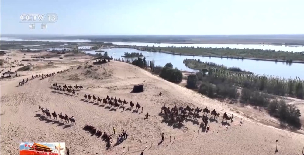 總臺(tái)記者 朱達(dá):寧夏銀川市黃沙古渡景區(qū)以一處千年古渡命名,匯集了黃河、沙漠、湖泊、濕地和田園等多種自然風(fēng)光。十一期間全國(guó)各地的游客來到黃沙古渡, 一方面可以欣賞大漠風(fēng)光、感受黃河文化 ,另一方面可以體驗(yàn)騎駱駝、沙漠沖浪和飛索等多種項(xiàng)目。