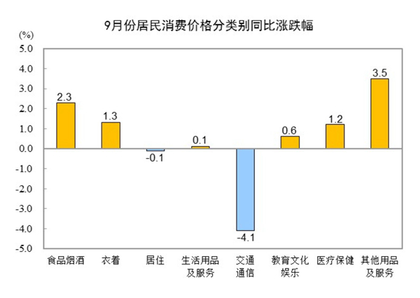 9月份,全國(guó)居民消費(fèi)價(jià)格環(huán)比持平。其中,城市下降0.1%,農(nóng)村上漲0.1%;食品價(jià)格上漲0.8%,非食品價(jià)格下降0.2%;消費(fèi)品價(jià)格上漲0.2%,服務(wù)價(jià)格下降0.3%。