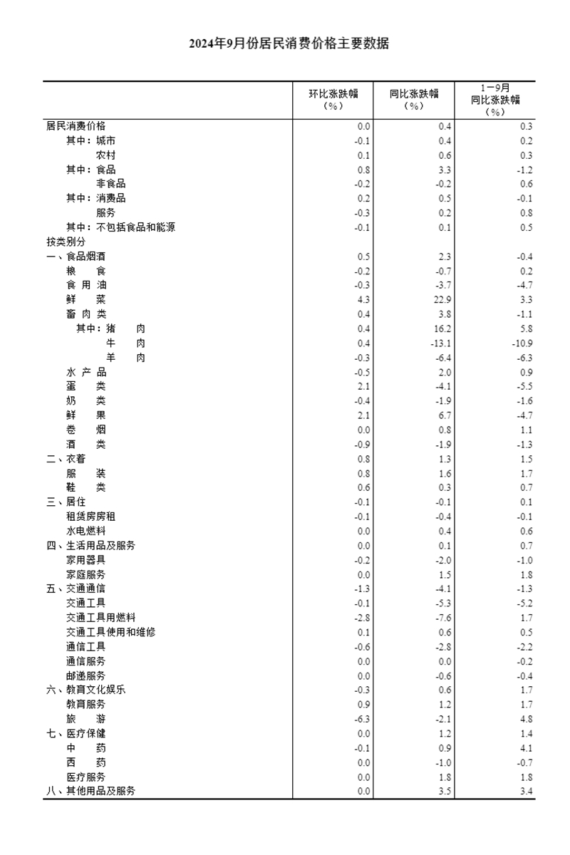 2024年9月份,全國(guó)居民消費(fèi)價(jià)格同比上漲0.4%。其中,城市上漲0.4%,農(nóng)村上漲0.6%;食品價(jià)格上漲3.3%,非食品價(jià)格下降0.2%;消費(fèi)品價(jià)格上漲0.5%,服務(wù)價(jià)格上漲0.2%。1—9月平均,全國(guó)居民消費(fèi)價(jià)格比上年同期上漲0.3%。
