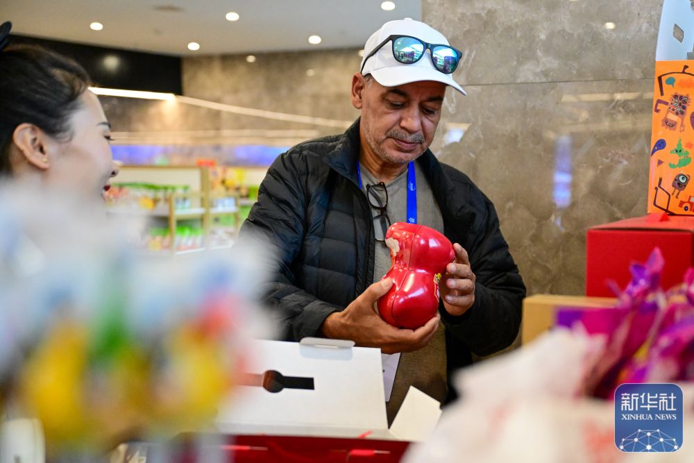 10月15日,與會嘉賓在新疆喀什跨境電商進(jìn)出口商品展示交易中心購買紀(jì)念品。