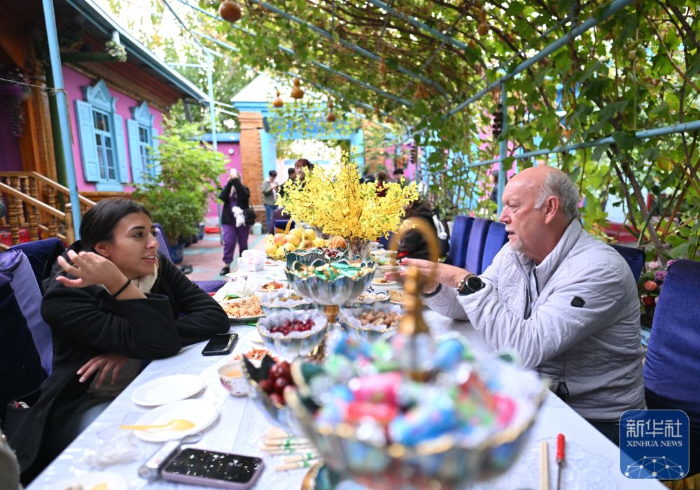 10月15日,與會嘉賓在伊寧市喀贊其民俗旅游區(qū)與表演者互動(dòng)。