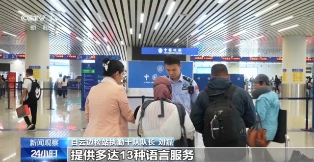 白云邊檢站執(zhí)勤十隊(duì)隊(duì)長(zhǎng) 劉磊:現(xiàn)場(chǎng)這邊的8條通道設(shè)置為廣交會(huì)專(zhuān)用通道,包括從廊橋到通道前,全程都設(shè)置了指引標(biāo)志和引導(dǎo)民警,提供多達(dá)13種語(yǔ)言服務(wù)。