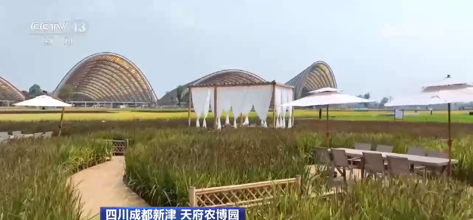 四川成都新津天府農(nóng)博園里,紫黑、紫紅、金黃三種特種稻種和大田水稻一起組成多彩圖案和造型,每畝預(yù)計產(chǎn)量躍上800斤的新高。稻田邊創(chuàng)意涌動,一杯杯稻田咖啡香醇四溢,一朵朵葵花正在向陽綻放,悠然演奏著喜悅豐收的“大地樂章”。