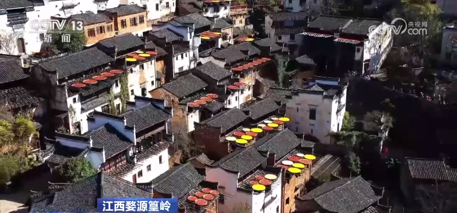 在江西婺源篁嶺,多種農(nóng)產(chǎn)品和徽派建筑對比鮮明,共同構(gòu)成了婺源獨特的“曬秋”景觀。優(yōu)質(zhì)的生態(tài)環(huán)境孕育了“紅、綠、黑、白、黃”五大特色物產(chǎn),“曬秋”成為“中國最美鄉(xiāng)村”的特有名片。