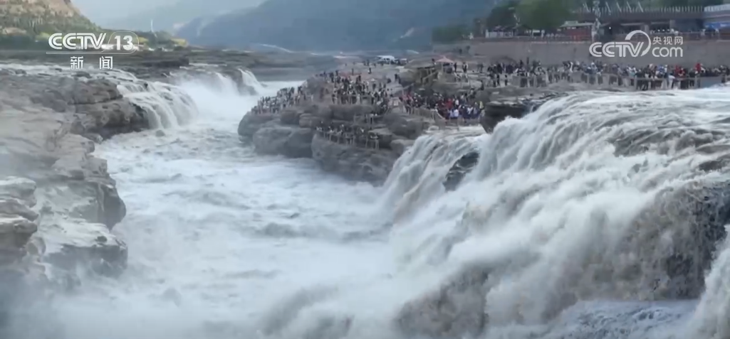 連日來,受上游水庫調(diào)節(jié)放水影響,位于山西吉縣和陜西宜川縣交界的黃河壺口瀑布水量豐沛。從空中俯瞰,黃河流經(jīng)晉陜峽谷到達(dá)壺口,水面由三四百米寬驟然收縮為50多米,再墜入“十里龍槽”,濺起數(shù)十米高的水霧,氣勢磅礴。據(jù)了解,黃河壺口段目前正處于秋汛期,最大水流量約為1300立方米/秒,是日常水流量的3倍,主瀑與副瀑連成一片,呈現(xiàn)出一條線狀,場面壯觀。進(jìn)入10月份以來,黃河壺口瀑布景區(qū)日均接待游客超過2萬人次。