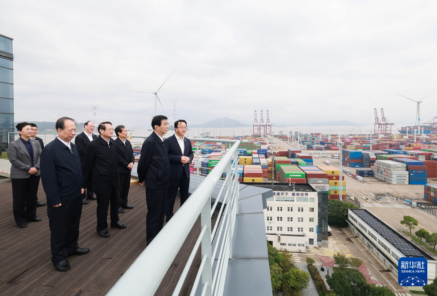 10月15日至17日,中共中央政治局常委、全國政協(xié)主席王滬寧在浙江省寧波市、溫州市調(diào)研。這是16日上午,王滬寧在寧波舟山港穿山港區(qū)了解生產(chǎn)運營和自由貿(mào)易試驗區(qū)建設(shè)情況。新華社記者 王曄 攝