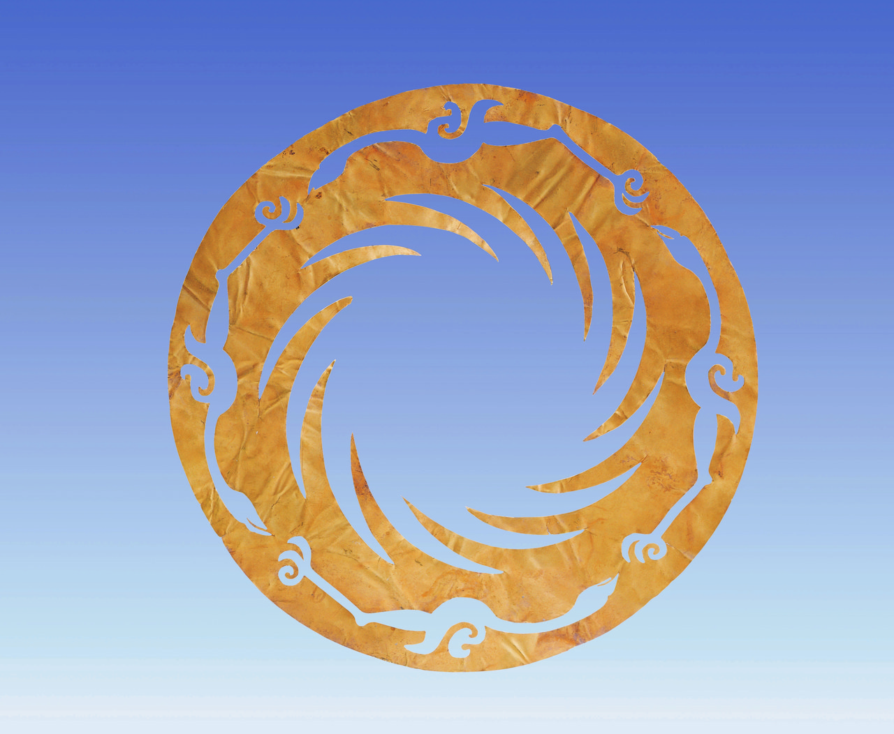 薄薄的一片,斜躺在透明展臺(tái)上,緩緩做360度旋轉(zhuǎn)。它的大小跟一張CD差不多,由含金量高達(dá)94.2%的金箔片制作,厚度僅0.02厘米。圖案分為內(nèi)外兩層,外層分布由等距的12條象征太陽的光芒組成,內(nèi)層由4只首尾相接的逆時(shí)針飛翔的太陽神鳥組成。整個(gè)圖案均衡對(duì)稱,充滿動(dòng)感。