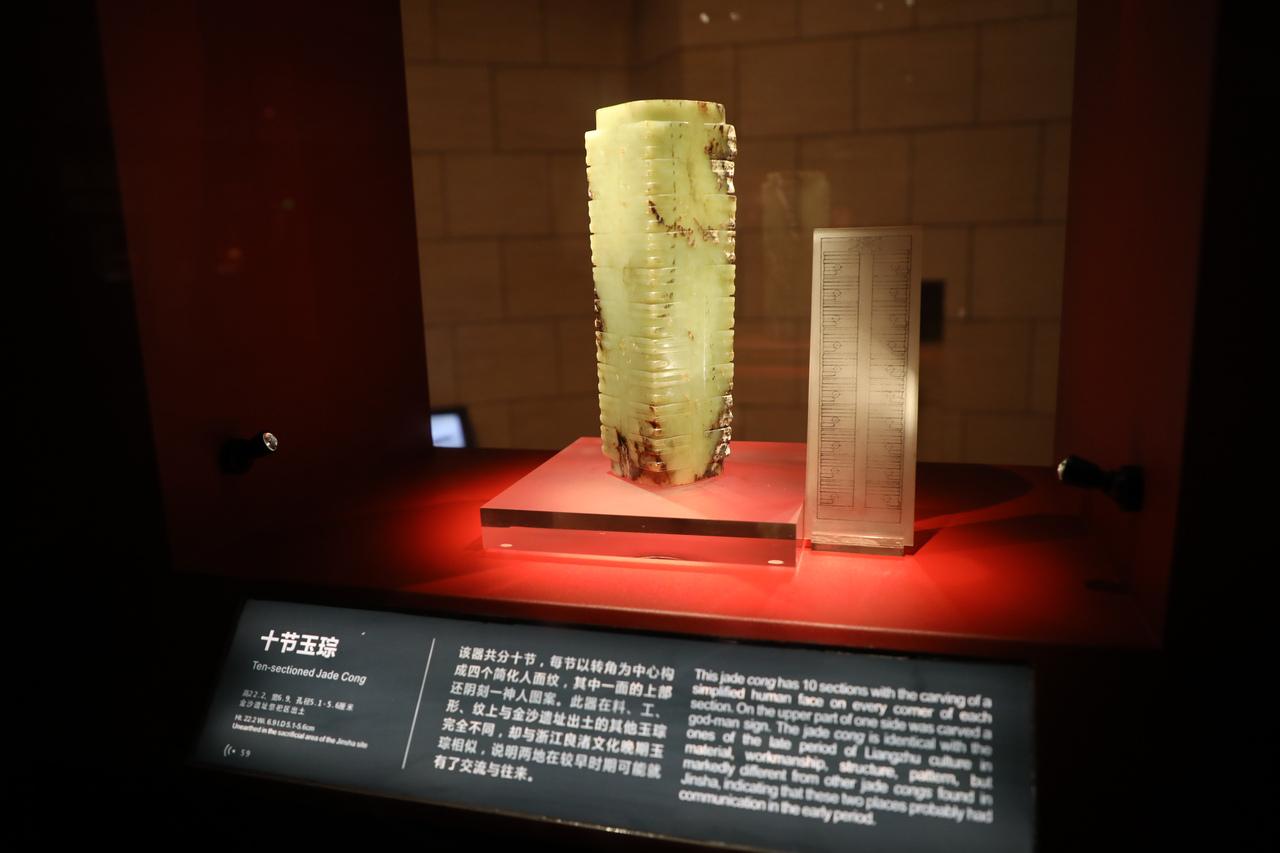 金沙遺址博物館鎮(zhèn)館之寶之一——十節(jié)琮,高22.2厘米,全器分十節(jié),每節(jié)有四個(gè)簡化的神人面紋,在上端的一面還陰刻有一神人圖案。這件玉琮的質(zhì)地與金沙遺址的其他玉琮完全不同,其造型風(fēng)格、紋樣圖案、制作工藝都與長江下游的良渚文化一致,應(yīng)是早于金沙1000多年的良渚人的產(chǎn)品。圖片由金沙遺址博物館提供
