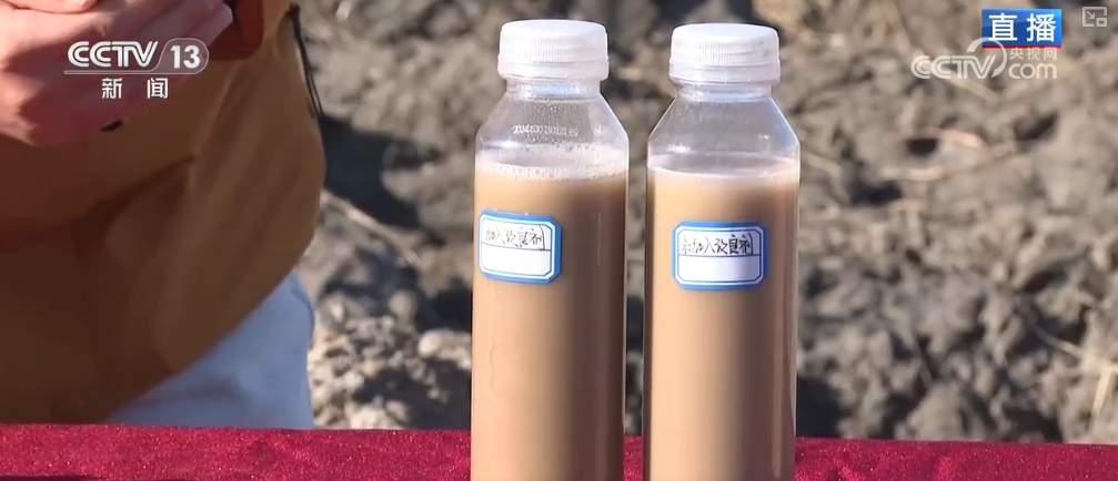 這片田采用的是有機硅改良劑來治理的鹽堿地,選取同地塊的鹽堿土溶于水中,加入有機硅后,土壤和水快速分層??梢钥吹?,有機硅具有較強的親土性,可以和土壤包裹一起,阻斷鹽分吸收,從而達到降堿和改變土壤板結的作用。這能讓水稻更好地扎根生長,渾濁的水變清澈,也可以增加作物的光合作用,有效治理重度鹽堿土壤。