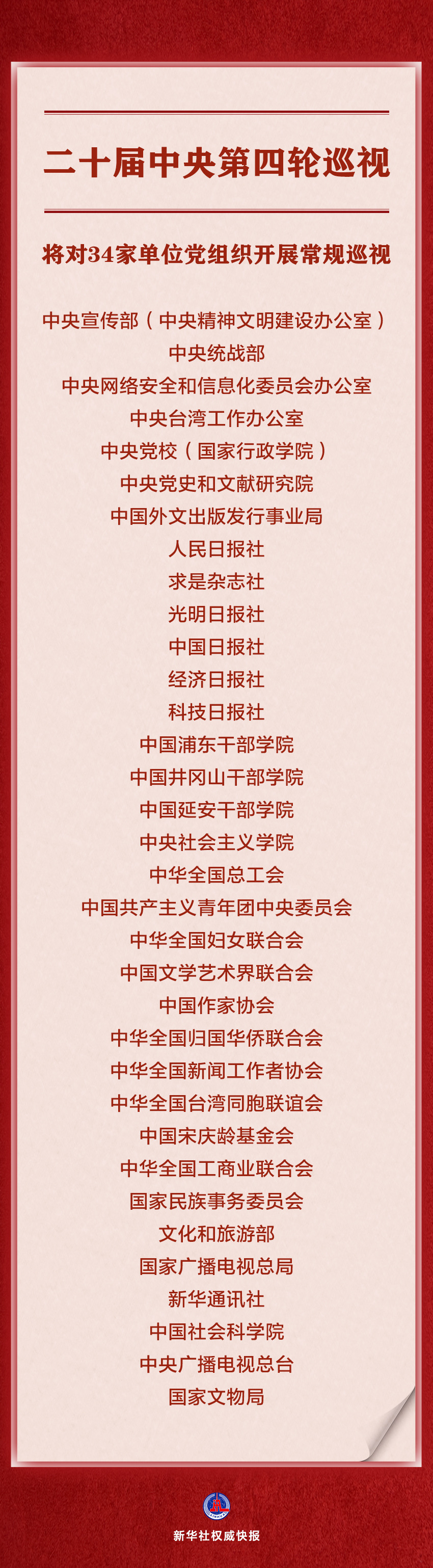 經(jīng)黨中央批準(zhǔn),二十屆中央第四輪巡視將對中央宣傳部(中央精神文明建設(shè)辦公室)、中央統(tǒng)戰(zhàn)部、中央網(wǎng)絡(luò)安全和信息化委員會(huì)辦公室、中央臺灣工作辦公室、中央黨校(國家行政學(xué)院)、中央黨史和文獻(xiàn)研究院、中國外文出版發(fā)行事業(yè)局、人民日報(bào)社、求是雜志社、光明日報(bào)社、中國日報(bào)社、經(jīng)濟(jì)日報(bào)社、科技日報(bào)社、中國浦東干部學(xué)院、中國井岡山干部學(xué)院、中國延安干部學(xué)院、中央社會(huì)主義學(xué)院、中華全國總工會(huì)、中國共產(chǎn)主義青年團(tuán)中央委員會(huì)、中華全國婦女聯(lián)合會(huì)、中國文學(xué)藝術(shù)界聯(lián)合會(huì)、中國作家協(xié)會(huì)、中華全國歸國華僑聯(lián)合會(huì)、中華全國新聞工作者協(xié)會(huì)、中華全國臺灣同胞聯(lián)誼會(huì)、中國宋慶齡基金會(huì)、中華全國工商業(yè)聯(lián)合會(huì)、國家民族事務(wù)委員會(huì)、文化和旅游部、國家廣播電視總局、新華通訊社、中國社會(huì)科學(xué)院、中央廣播電視總臺、國家文物局等34家單位黨組織開展常規(guī)巡視。