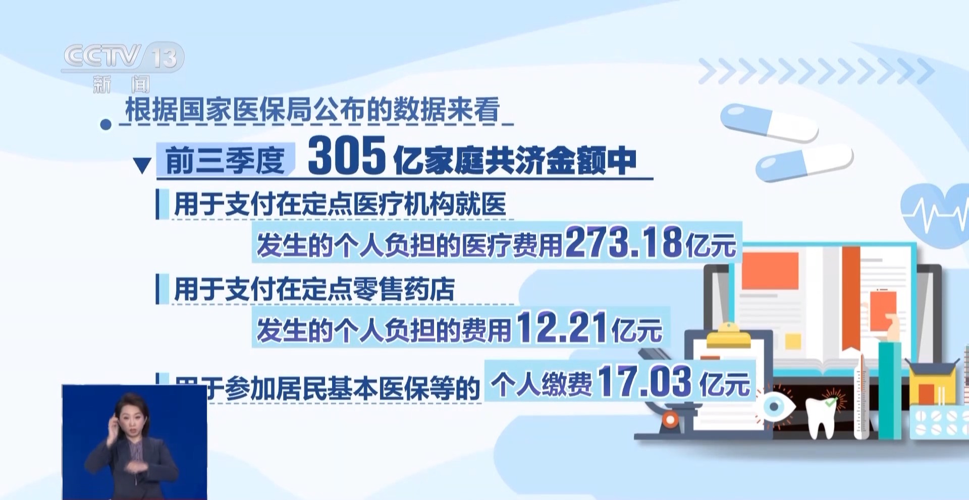 根據(jù)國家醫(yī)保局公布的數(shù)據(jù)來看,前三季度的305億家庭共濟金額中,用于支付在定點醫(yī)療機構(gòu)就醫(yī)發(fā)生的個人負擔(dān)的醫(yī)療費用273.18億元,用于支付在定點零售藥店發(fā)生的個人負擔(dān)的費用12.21億元,用于參加居民基本醫(yī)保等的個人繳費17.03億元。