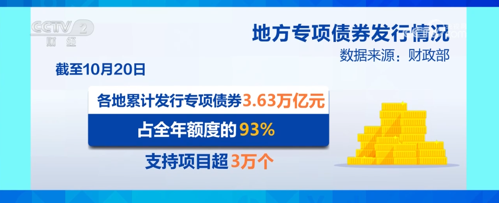 數(shù)據(jù)顯示,9月份,全國一般公共預算支出、政府性基金預算支出同比分別增長5.2%和34.2%。同時,地方專項債券發(fā)行加速,9月發(fā)行約占全年額度的26%。截至10月20日,各地累計發(fā)行專項債券3.63萬億元,占全年額度的93%,支持項目超3萬個。