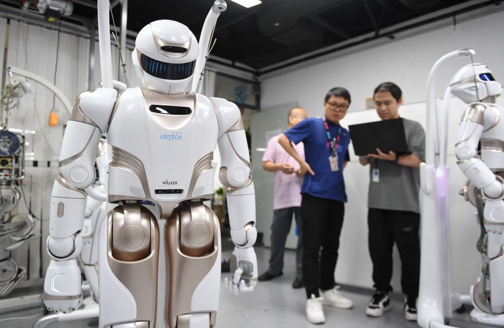 2024年6月26日,在位于深圳市南山區(qū)智園的優(yōu)必選總部,工作人員對人形機器人進行測試。新華社記者毛思倩攝