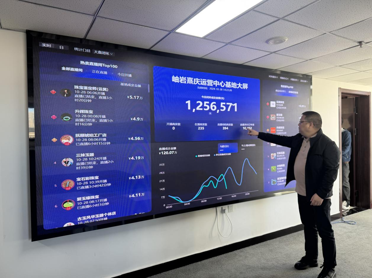“1256571元,這是我們一上午的交易額”,岫巖熹慶運(yùn)營中心的負(fù)責(zé)人指著墻上的大屏幕說:“通過這塊屏幕,不僅能實(shí)時看到各家商戶的開播、交易情況,還可以通過數(shù)據(jù)的波動及時發(fā)現(xiàn)存在的問題?!?/p>