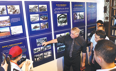 格林(左二)在長汀舉辦的飛虎隊主題歷史圖片展上講述歷史照片背后的故事。