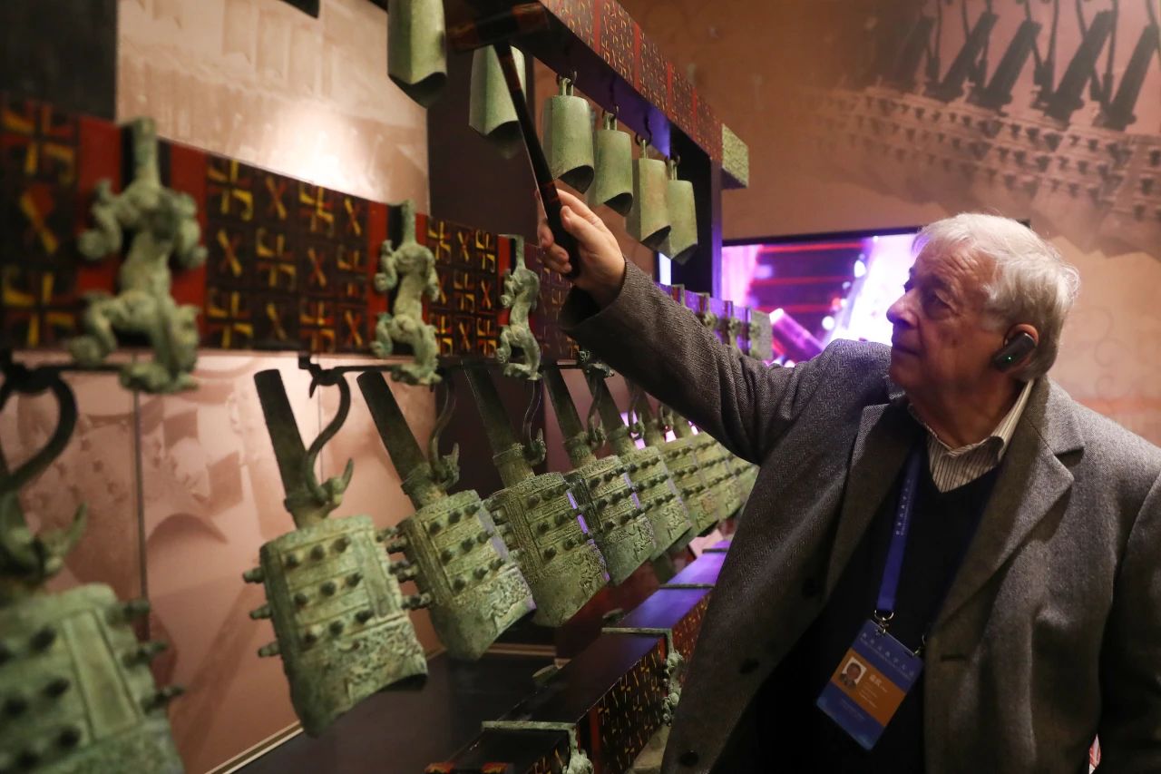 2024年11月6日,北京,專(zhuān)家學(xué)者在中國(guó)考古博物館體驗(yàn)編鐘。張祥毅 攝