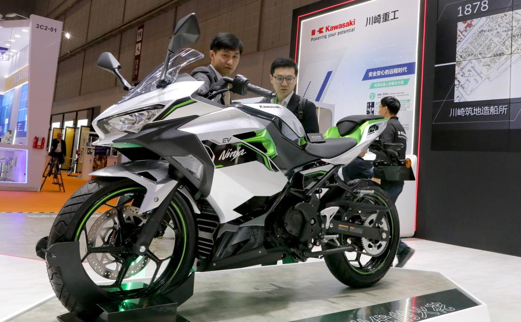 11月6日,工作人員(左)在川崎公司展臺(tái)為參觀者介紹一款電動(dòng)摩托車(chē)。這是該產(chǎn)品在進(jìn)博會(huì)上的首展。新華社記者 方喆 攝