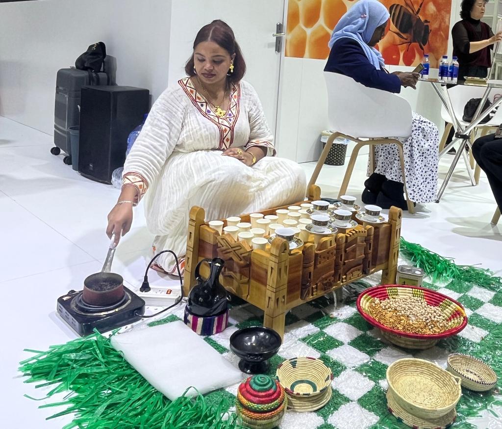 在埃塞俄比亞國家館展區(qū),埃塞俄比亞咖啡師在現(xiàn)場烘焙咖啡豆,展示當(dāng)?shù)乜Х任幕#ㄊ茉L者供圖)