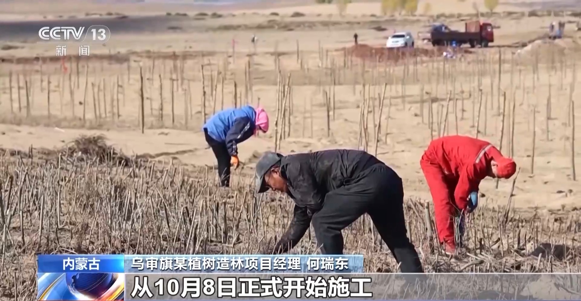 烏審旗某植樹造林項目經(jīng)理 何瑞東:挖樹坑嚴格保證至少在1米,保證種植深度,及時澆水,保證每棵樹都要種到位、澆到位。從10月8日正式開始施工,總占地治理面積是3225畝。