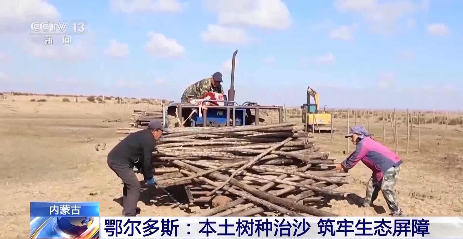 烏審旗某植樹造林項目經(jīng)理 何瑞東:旱柳苗木是從烏審旗周邊農(nóng)牧民自己家的柳樹進回來的,有效地提高當?shù)啬撩竦囊徊糠质杖?。我們嚴格收料,控制苗木的高度、胸徑,以及苗木質量。苗木運來后要充分泡苗,充分地讓旱柳把水分吸收,開始要根部蘸漿,蘸一種肥料,促進根部發(fā)育,然后用到施工現(xiàn)場。