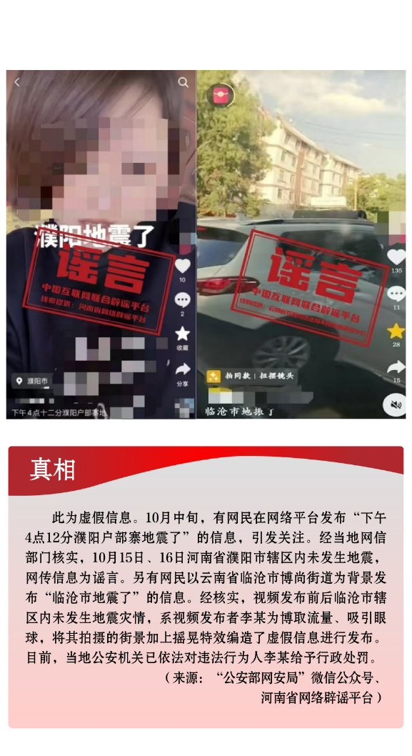 危言聳聽炒作話題。個別網(wǎng)民和自媒體編造虛假信息,炒作社會熱點話題,并配以具有煽動性、誤導(dǎo)性的標(biāo)題,擴散傳播,擾亂社會秩序。10月中旬,新疆喀什、阿克蘇地區(qū)相繼發(fā)生地震,部分自媒體罔顧事實,利用AI技術(shù)拼湊網(wǎng)絡(luò)舊圖,編造完全與事實不符的地震廢墟或災(zāi)后救援圖片,混淆視聽,嚴重誤導(dǎo)網(wǎng)民。另有個別網(wǎng)民將拍攝的街景加上搖晃特效,惡意杜撰云南發(fā)生地震,引發(fā)公眾恐慌,造成不良影響。還有網(wǎng)民為給網(wǎng)店營銷引流,利用家長們高度關(guān)注兒童安全話題的心理,無中生有編造“四川巴中頻繁有青少年失蹤”謠言,引發(fā)公眾焦慮恐慌。