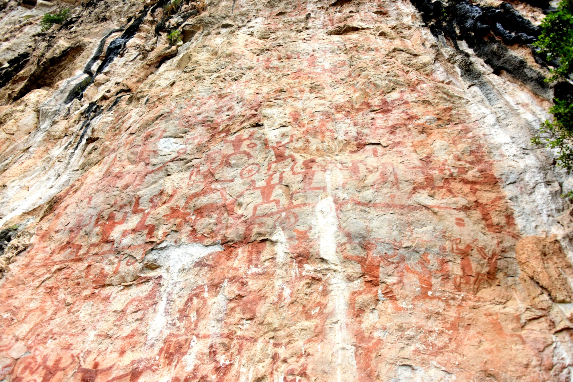 花山,坐落于崇左市寧明縣城西北約25公里的明江河畔,以其古老神奇的巖畫而聞名海內(nèi)外。花山巖畫距今已有2000多年的歷史,刻著人、獸、銅鼓、刀劍、羊角鈕鐘等造型各異的赭紅色圖像,記錄著壯族先民古駱越人的生活、生產(chǎn)和宗教信仰,為中國(guó)首個(gè)巖畫類世界文化遺產(chǎn)。