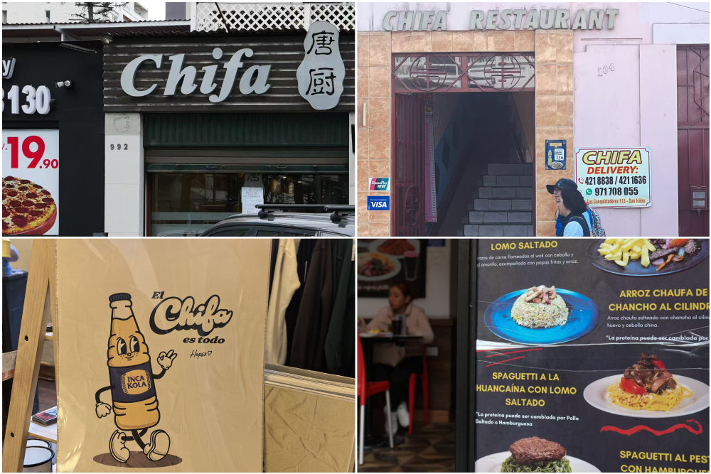 綿延不斷的人文交流,讓秘魯?shù)娘嬍硯狭嗣黠@的中餐印記:中餐館在秘魯被稱作“Chifa”(吃飯)(左上、右上)。炒飯(Chaufa)作為常規(guī)食物,登上了大多數(shù)當(dāng)?shù)夭宛^的菜單(右下)。Chifa一詞,還被利馬的年輕畫家化用為文化符號,與本土飲料“印加可樂”一起融入到藝術(shù)創(chuàng)作中(左下)。