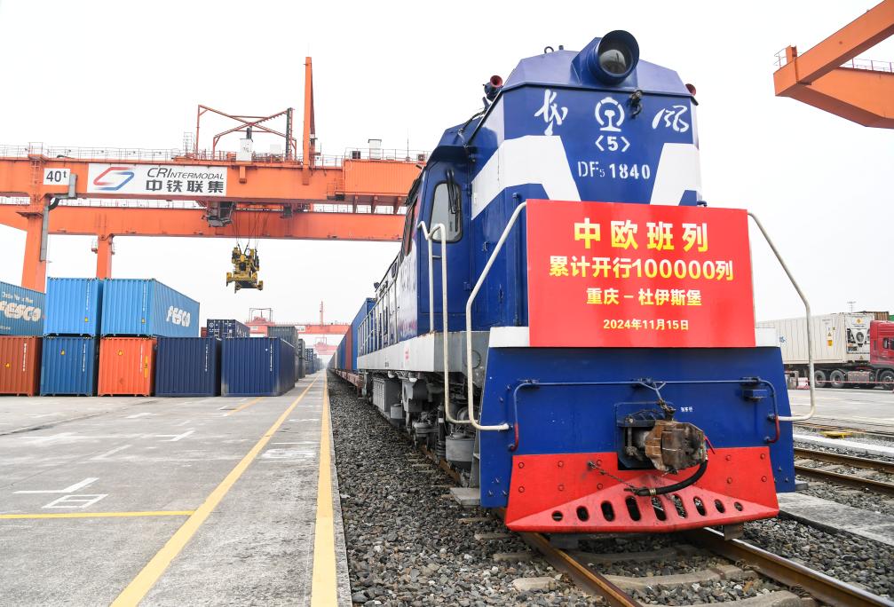 11月15日,第10萬列中歐班列——X8083次中歐班列(重慶—杜伊斯堡)在重慶團結(jié)村中心站準(zhǔn)備發(fā)車。新華社記者 王全超 攝